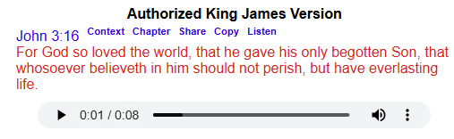 Please note: Bible SuperSearch does NOT offer audio Bible files for listening or download at this time, nor do we offer audio Bible support through our official API at api.biblesupersearch.com. If you desire audio Bible features, you must first install the BibleSuperSearch API on your website, and then source the audio files from a 3rd party.