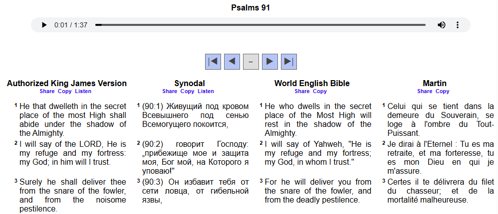 Please note: Bible SuperSearch does NOT offer audio Bible files for listening or download at this time, nor do we offer audio Bible support through our official API at api.biblesupersearch.com. If you desire audio Bible features, you must first install the BibleSuperSearch API on your website, and then source the audio files from a 3rd party.